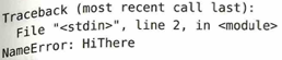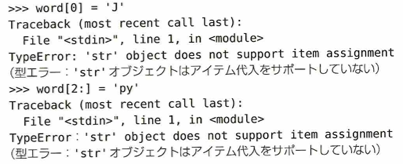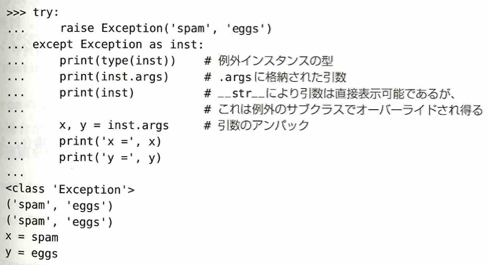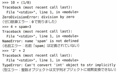 例外のほとんどはプログラムでは処理されず、その結果はエラーメッセージにあらわれます。エラーメッセージの最終行には、NameError、TypeErrorなど例外の型が記されています。