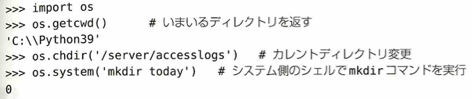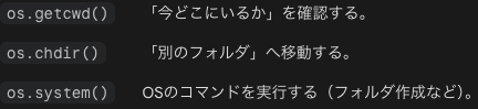 osモジュールにはファイルやディレクトリを操作する関数が定義されています。os.getcwd()でカレントディレクトリを取得し、os.chdir(移動先)でカレントディレクトリを移動します。
