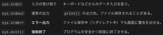 if __name__ == '__main__':」は、インタープリタで関数が意図せず実行されないようにしたり、「python module.py」でfunc()を確実に実行するために記述します。読み書き両用はr+です。try文に複数のexcept節がある場合、一度の処理で実行されるexcept節は一つまでです。「ハンドラ」とは「except節で設定した処理」を指します。