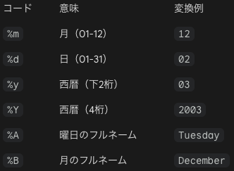 文字列スライスにおいて負数で指定する文字列スライスの場合は右端の文字の右側が0で左に向かって順に-1,-2,…と文字が小さくなります。b,d,x,f,%はそれぞれ値を2,10,16進数で表す、値を与えられた精度までの小数で出力する、値を100倍士パーセント記号がついた形式で出力します。例えば7dは右寄せ7桁幅で「 15000」などと表示されます。