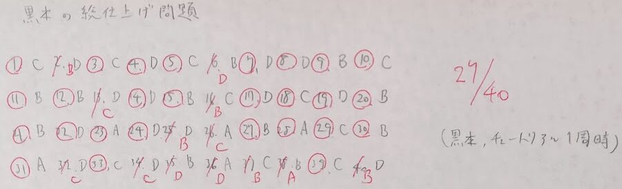 本番では24/40を確実に取っておけば残り16問のうち期待値的には4問を正解するのでギリギリ合格点の28点に届くだろうという気持ちで挑みました。模試では合計11回挑戦して合格点を超えた回数が5回でしたので、かなり慎重に挑みました。本番はリラックスして受験することができ、35/40という成績で合格することができました!