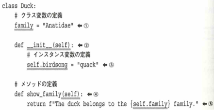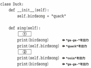 クラスのインスタンス化は、duck=Duck( )です。クラス( )はインスタンスを返り値とする関数です。メソッド内にインスタンス変数と同名の変数がある場合、それらは別の変数として扱われます。