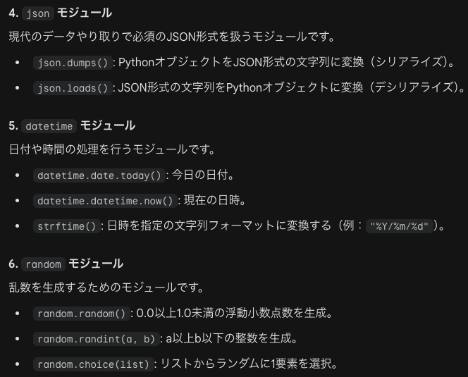 フォーマット演算子でbは2進数、xは16進数です。リストの要素を加えるときは.append(値)の他に、+=[値]もあります。sorted( )関数は昇順です。関数定義の最後には:を付けます。*はタプル、**は辞書。
