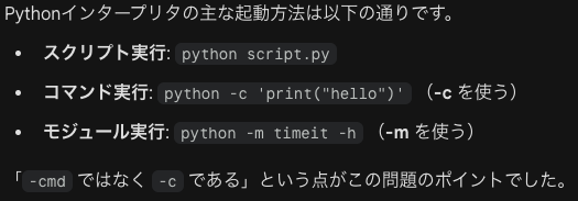 インタープリターを対話モードで起動すると、プロンプトが>>>と表示されます。インタープリターは、引数をつけて実行できます。この引数は、sysモジュールのargv属性で取得できます。 引数にソースファイル名を指定すると、そのファイルを実行します。さらに、python -m モジュール名とすると、モジュールのソースファイル名を完全な形で指定したかのように実行できます。
