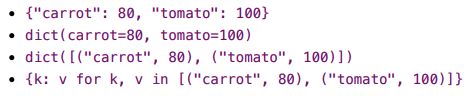 ディクショナリは、dict("carrot"=80, "tomato"=100)と書くことはできません。