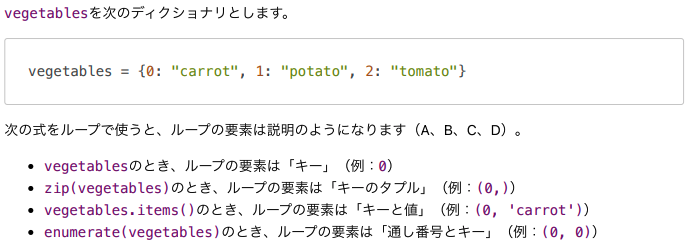 ディクショナリのitem()メソッドについて、data.items()という表記でキーと値を同時に取得できます。