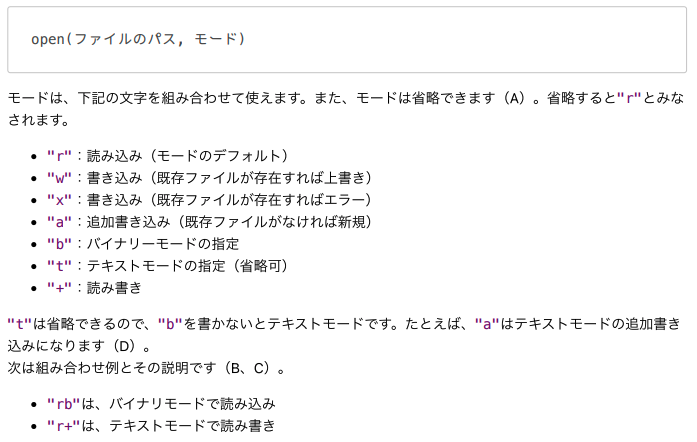 open()はファイルオブジェクトを返す関数です。open関数は第1引数にファイル名を、第2引数にモードを与えて使います。モードはファイルを読み込み専用で開くなら「r」、書き出し専用なら「w」、追加なら「a」、読み書き両用なら「r+」を指定します。