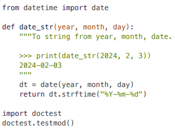 す。具体的には、print(date_str(2024, 2, 3))を実行し、その出力が2024-02-03と同じかどうかをチェ
