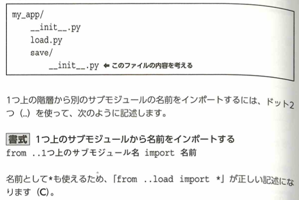 インポートされるファイルをモジュールといいます。import calendar、calendar.prmonth(2000,1)などとします。しかし関数のみをインポートする場合は、from calc import addなどとします。名前をすべてインポートする場合はfrom calc import * などとします。ただし_で始まらない名前すべてです。__all__があれば、そのリストの名前だけインポートされます。