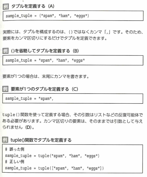 リストとタプルは異なるデータ型の要素を格納できます。リストは既に存在する要素の値を変更できますが、タプルはこうした変更ができません。タプルは定義後は後から要素の追加はできません。