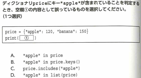 値 in ディクショナリ のようにin演算子でキーの存在を確認できます。key()メソッドの返り値にin演算子を用いても良いです。ディクショナリのメソッドにincludes()はありません。