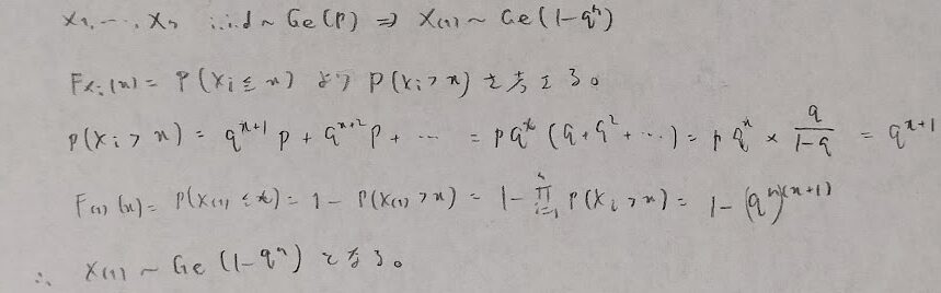 また最小統計量においては有名な次の性質もありますので紹介します。アクチュアリー数学では必須の公式です。これは意味を考えても納得がいきます。最初に成功するまでの失敗回数で最も早いものが従う分布は、少なくとも1回成功する確率に相当する量をパラメータに持つからです。