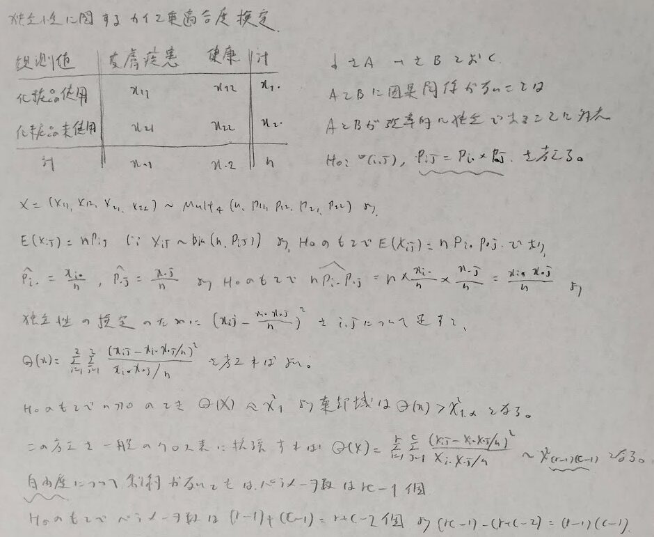 次は独立性に関するカイ2乗適合度検定について学びます。大きくカイ2乗適合度検定の中の1つの例としてとらえて欲しいです。最尤推定値からスタートすることがポイントです。