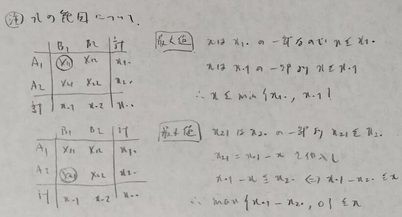 フィッシャーの正確性検定では超幾何分布を考えることになります。ここでxの範囲ですが、本書『データ解析のための数理統計入門』含めほとんどの書籍で考え方が端折られていたので、考え方をまとめてみました。