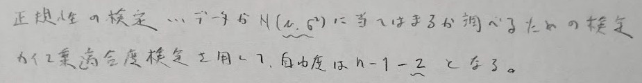 実際に正規性の検定を考えます。こちらもカイ2乗適合度検定を用います。ただしパラメータの自由度に注意です。
