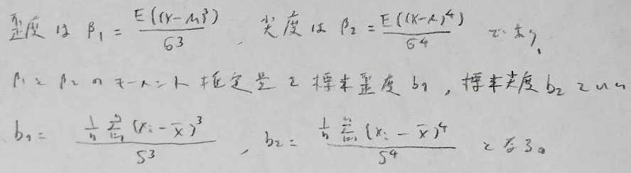 歪度(正だと右に裾の長いグラフ)と尖度も標本歪度と標本尖度があります。こちらはモーメント推定量から考えれば式の結果に納得がいきますね。