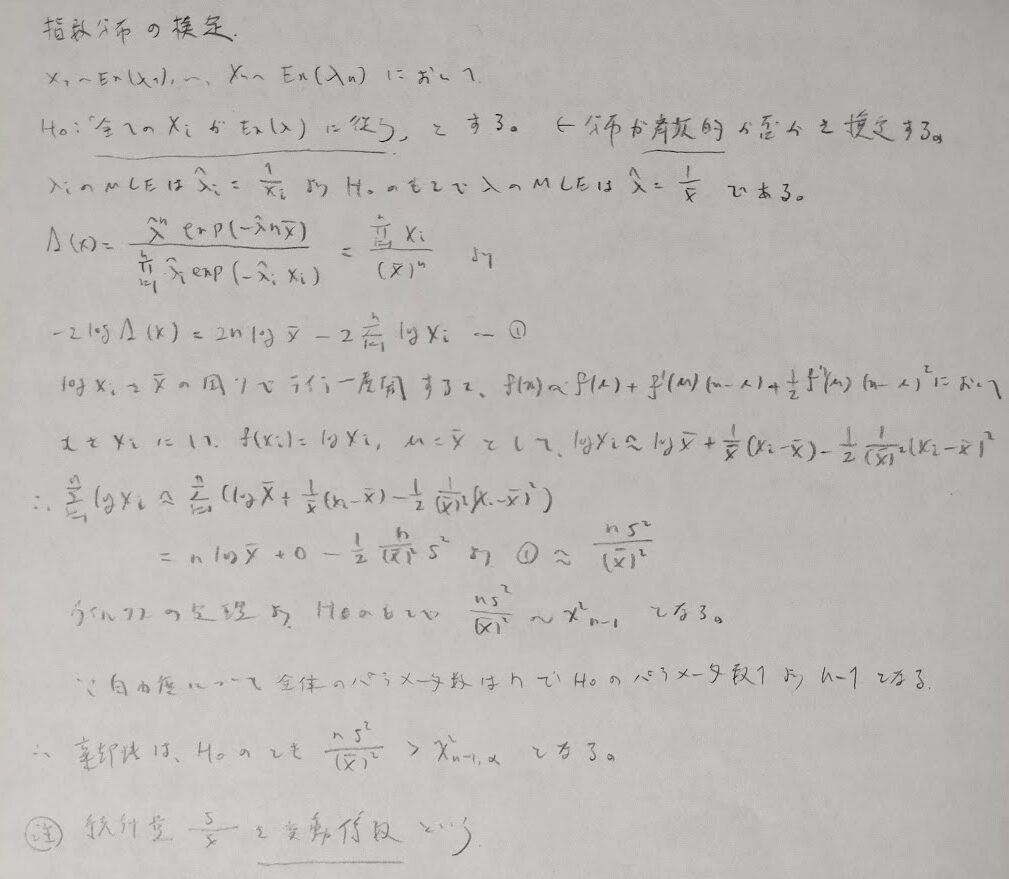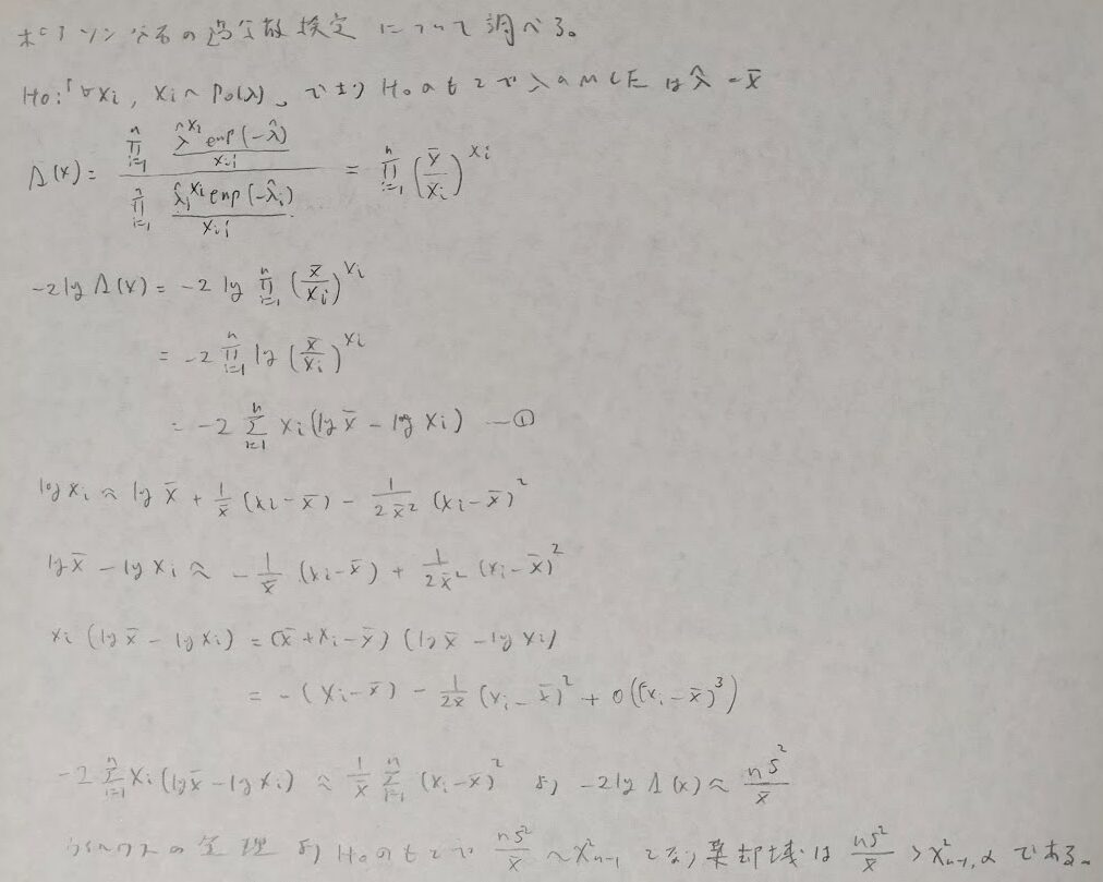 次に指数分布とポアソン分布に関する検定を学習します。ともにn個の確率変数が同一パラメータを持つ指数分布やポアソン分布に従うか?を考える問題です。前者を斉次的か否かの検定、後者を過分散検定などと言います。