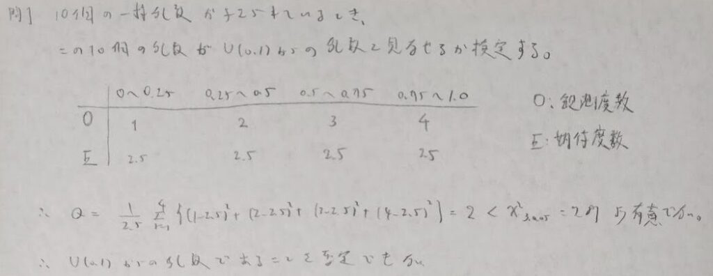 今回の問題で0.1刻みなどで考えてしまうと、期待度数の条件(すべての期待度数が1以上、期待度数の80%が5以上)を満たせなくなりますのでNGです。このようにデータ数が少ない場合にはコルモゴロフ-スミノロフ検定(KS検定)が奨励されます。