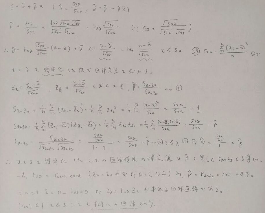 回帰直線を求めて式変形を行います。その際に生じた標本相関係数について深めます。特にデータを標準化した後で求めた回帰係数は元の変数の相関係数と一致します。