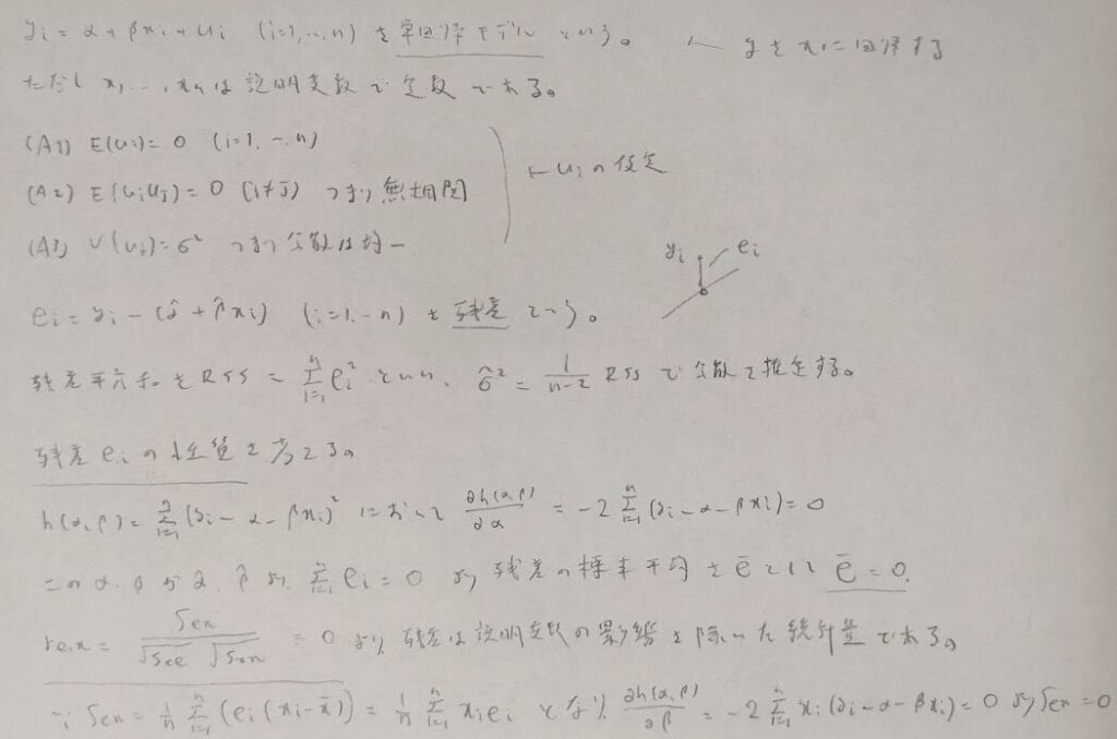 次に単回帰モデルを考えます。モデルという言葉が入るので誤差に確率変数を導入します。誤差項における仮定の導入に注意しましょう。ここでは残差についての重要な2つの定理を導きます。それは残差の和が0となること、そして残差とデータとの標本共分散も0となることです。