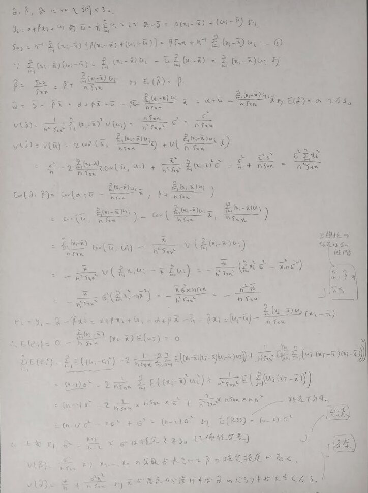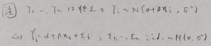 切片の推定値、回帰係数の推定値が従う分布について考察し、誤差の推定にRSS(残差平方和)が出てくる箇所にも言及します。ポイントはこの段階では正規性の仮定がないことです。すなわち一般的な話になります。