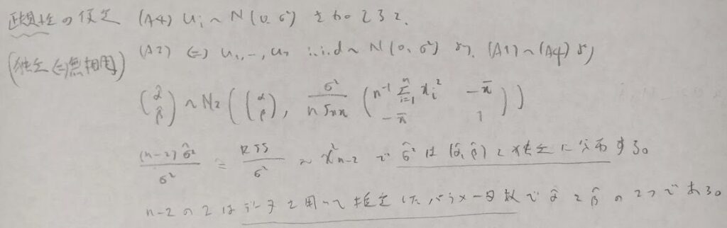 ここまでは誤差項が無相関という性質のみを用いました。ここで無相関と独立が同値になる正規分布の性質を加えます。すなわち正規性の仮定を導入した場合について先ほどの議論の続きを考えます。