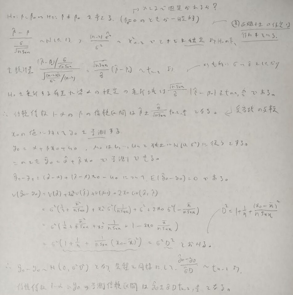 推定量の従う分布が判明したので、仮説検定や信頼区間の議論が可能となります。ここでは変数間に因果があるか?という観点での仮説検定を導入します。信頼区間の話題では、予測誤差に関しても議論が展開できます。