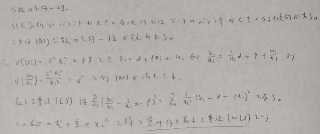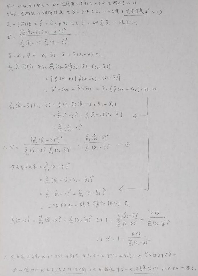 単回帰モデルに置き換えることにより導出ができます。アクチュアリー数学2024にも誘導付きで出題された内容です。次は重回帰モデルになります。残差平方和関連の厳密な証明が与えられることになります。