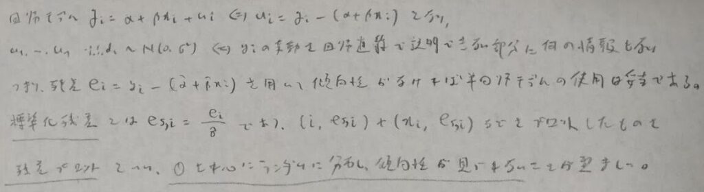 残差分析の方法について学びます。残差プロットに規則性や傾向性がないことが望ましいです。この残差分析では誤差全体の期待値が0になっているはずです。これは(A1)誤差項の期待値が0であることに相当します。