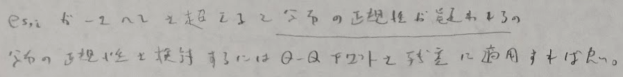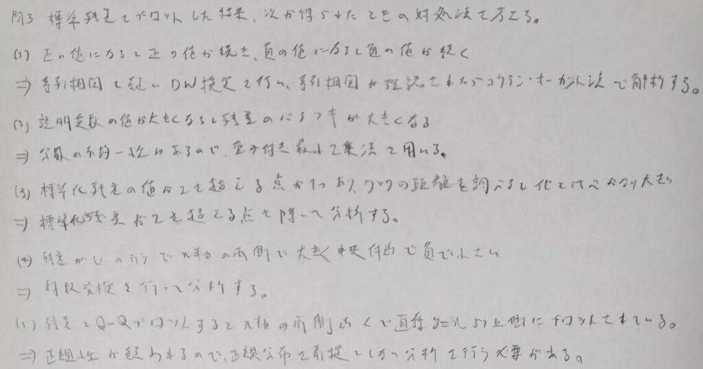 誤差項について(A4)正規性の仮定、(A3)分散の均一性、(A2)誤差の無相関性の検討ができます。この順に考察していきます。