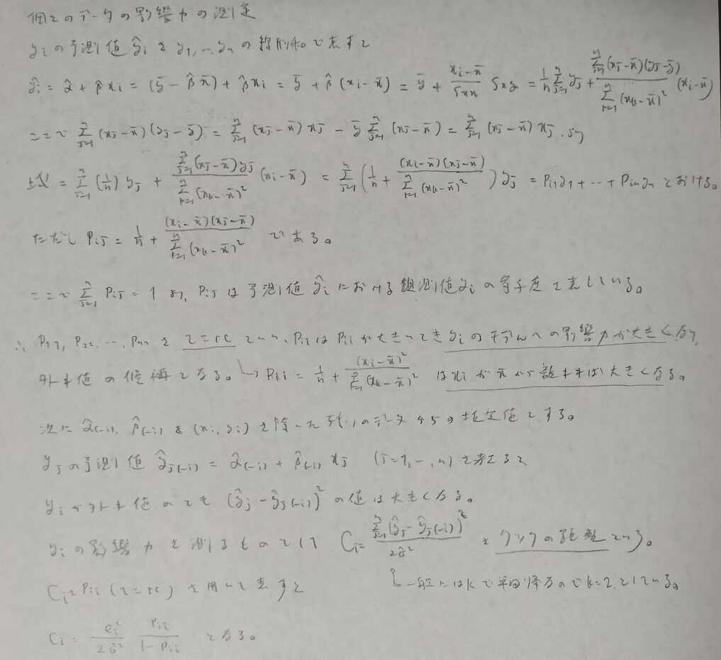 最後に個々のデータの影響力について、てこ比とクックの距離を扱います。クックの距離について難易度は単回帰分析においてラスボス的です。