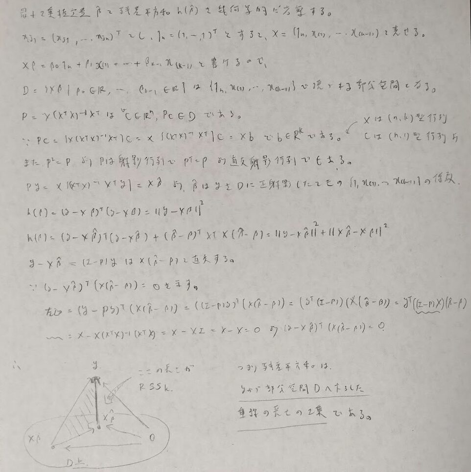 残差平方和が表す幾何的な意味を考えます。直交射影行列Pが大活躍します。Pの2乗がPと等しい行列は射影行列であることの必要十分条件です。一度射影したものをもう一度射影しても変わらないことから冪等性が成り立つわけです。
