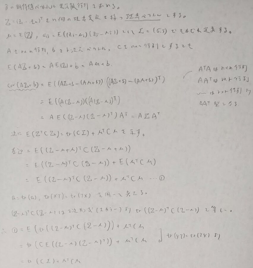 期待値ベクトルと(分散)共分散行列を定義し性質を確認します。最後の性質は2次形式の期待値の重要な性質でトレースが出てくることが特徴です。また後ほど登場しますが2次形式とコクランの定理も相性最高です。