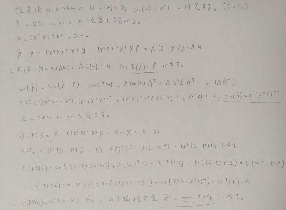 2次形式の期待値の重要性質を用いて、βの最小2乗統計量の性質や誤差分散の不偏推定量を結果を導きます。単回帰分析の記事で出てきた内容が重回帰分析の中で証明されたわけです。