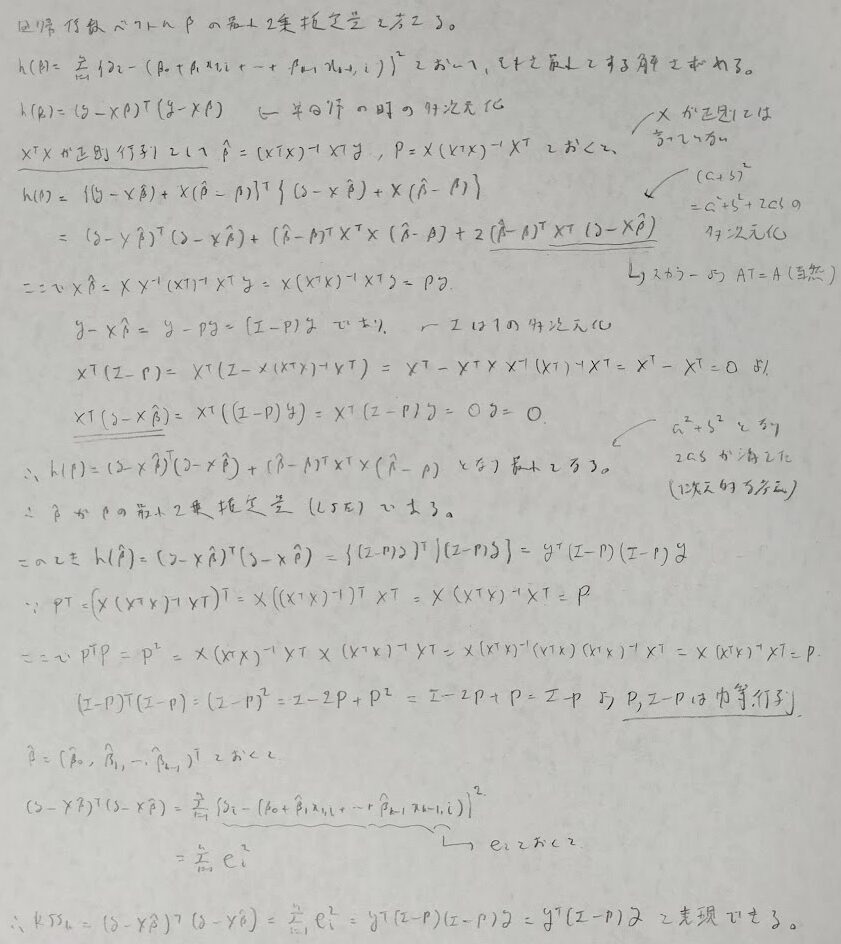 本書ではβの最小2乗統計量に当たりをつけて、それが残差平方和を最小にすること、そしてその根拠に射影行列Pを導入することによって証明しています。証明の途中で冪等行列の考察が重要になってきます。