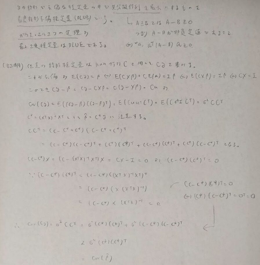 いよいよガウス・マルコフの定理です。ここでも上で用いた誤差の期待値が0ベクトルになるなどの性質は保存されたまま用います。