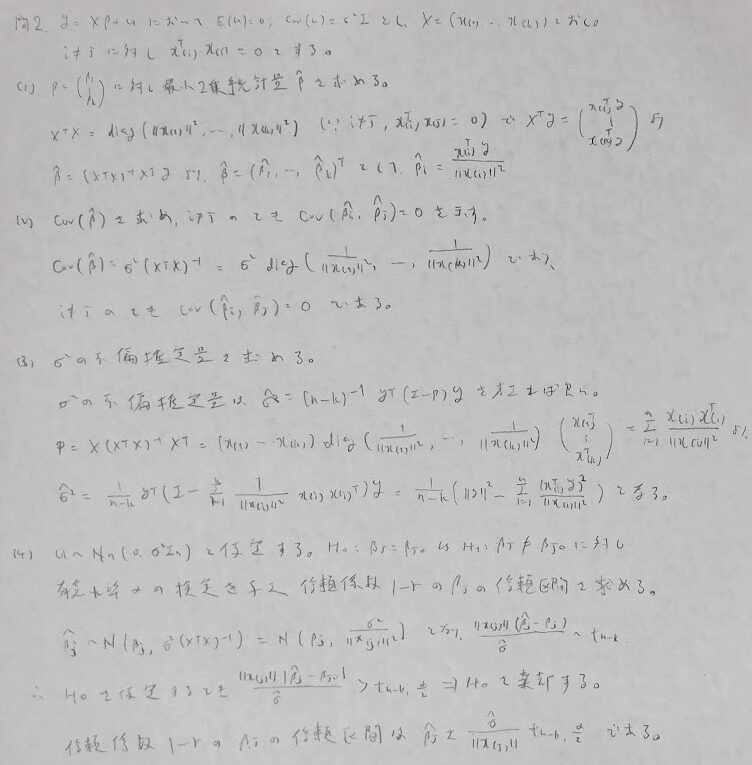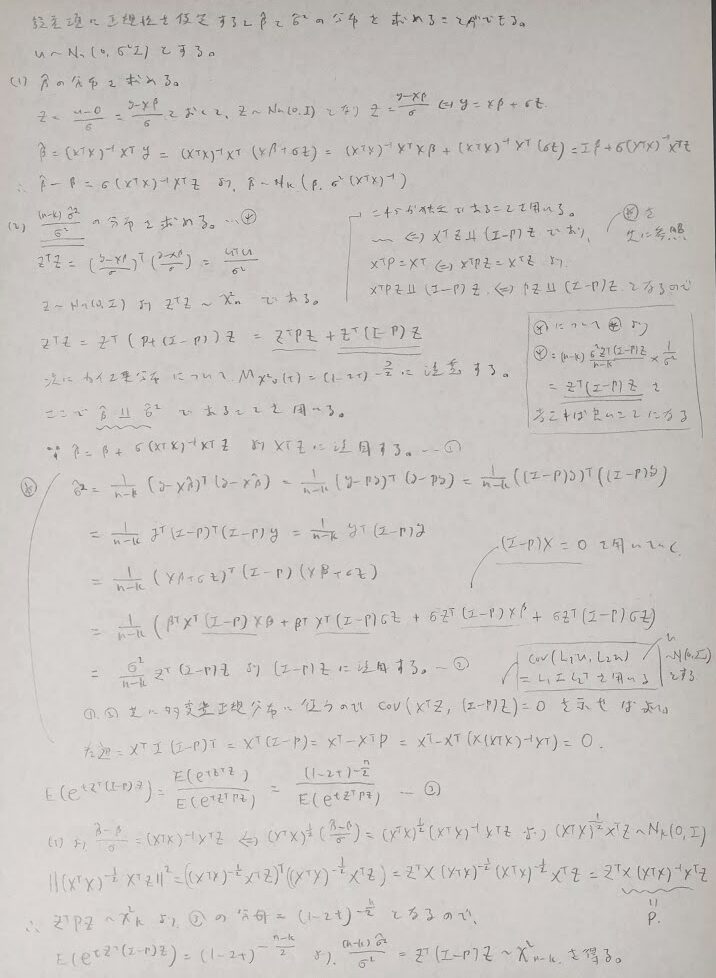次は誤差項に正規性を仮定する場合になります。どんどん仮定がキツくなっていることに注目しましょう。ただしここの部分の証明の理解が難しくかなり苦戦しました。