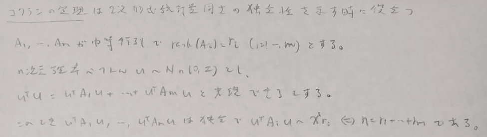 重要な箇所は多変量正規分布に従っている確率変数の2乗(に相当する部分)が左辺にきて、右辺が2次形式(対照性の仮定)で表せたとして、その表現行列のランク(を出す際にトレースを用いるため冪等性の仮定が必要)の和が多変量正規分布の次元に等しいことが言えれば、独立性とカイ2乗分布の自由度が一気に確定してしまう強力な定理となります。
