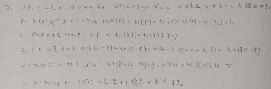 コクランの定理は多変量の正規分布と相性が良さそうです。またいろんなバージョンがあり、『データ解析のための数理統計入門』で解説している内容は最も一般的な場合のようです。準備段階として以下のTweetにて冪等行列においてトレースが出てくる根拠の周辺について解説しています。