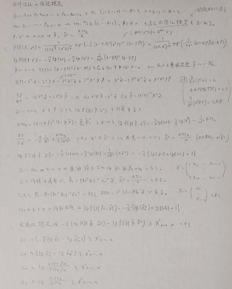 統計検定やQC検定にも登場する頻度の高い仮説検定との絡みに入ります。ここでは有意水準αの検定にピッタリはならないものの近似でも良いのでとにかく検定を求めたい!という時のための尤度比検定、そして有意水準αにピッタリとなる検定(今回はF検定とt検定)の2種類をこの順で導出します。尤度比検定では汎用性の高いバージョンで紹介します。