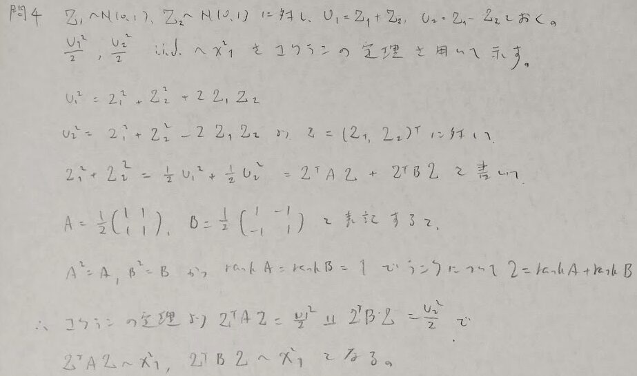 コクランの定理を最後に使っていますが、左辺の2とは、2つの確率変数Z_1とZ_2が2変量標準正規分布に従っていることの2です。対称行列の確認が抜け落ちているように感じますが、それは2次形式で表現できていることから自明と見做します。