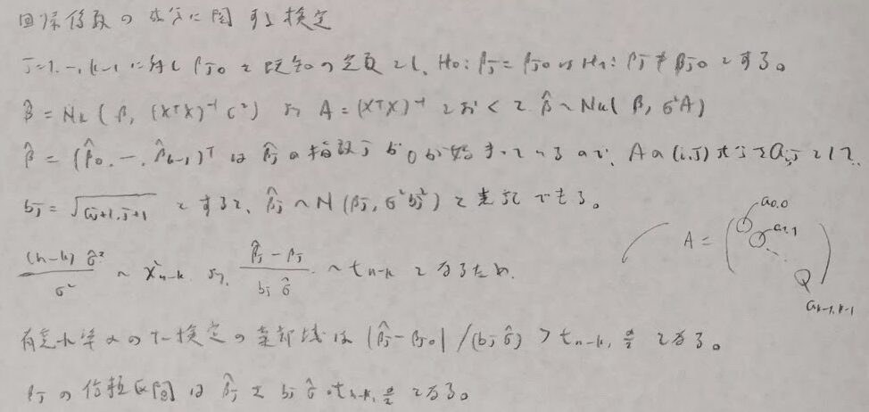 次に特定の回帰係数の成分に関する検定について考えます。こちらはt検定になります。こちらは回帰係数の推定量の周辺の対角成分がポイントになります。