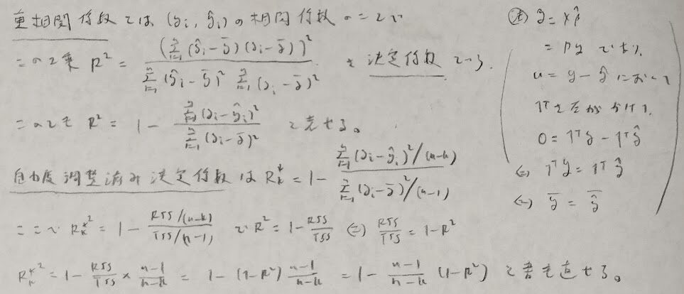重回帰分析では変数選択が大事になります。そのため決定係数関連の話題を整理します。決定係数は重相関係数の2乗になります。