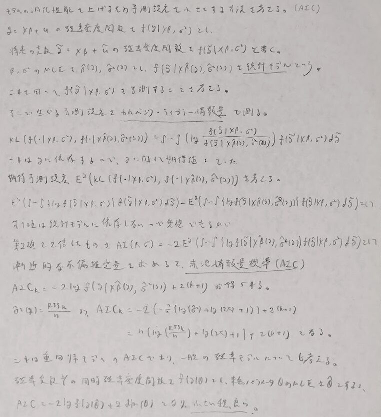 次に予測誤差を小さくするための方法を考えます。カルバック・ライブラー情報量で測ります。またそれを用いた際の期待予測誤差を考えます。統計モデルに依存する部分の漸近的な不偏推定量が赤池情報量規準(AIC)となります。結局対数尤度を中心に計算していることになります。