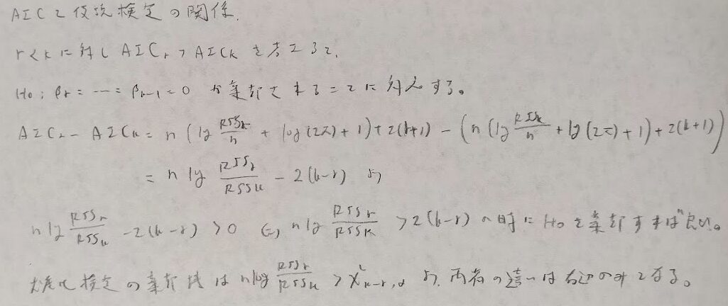 またAICは変数選択における尤度比検定と類似点があります。どちらが評価が甘いかは右辺の値で判断できます。