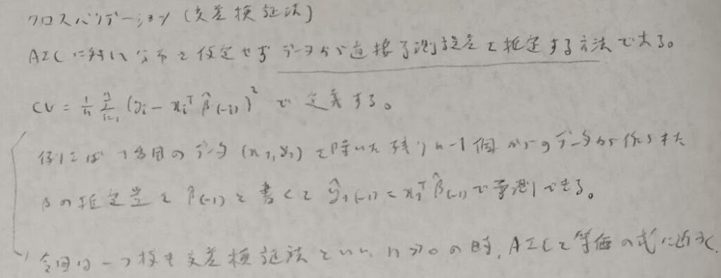 AICは分布を仮定して議論を展開しました。分布が用意できない場合はクロスバリデーションを用いて直接予測誤差を推定します。