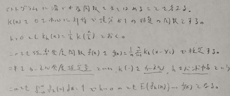 次にヒストグラムを関数で当てはまることを考えます。あまり類書では馴染みがない部分だと思い、まずは定義から解説し次に例を通して下記に書かれている細かい内容を証明していきます。