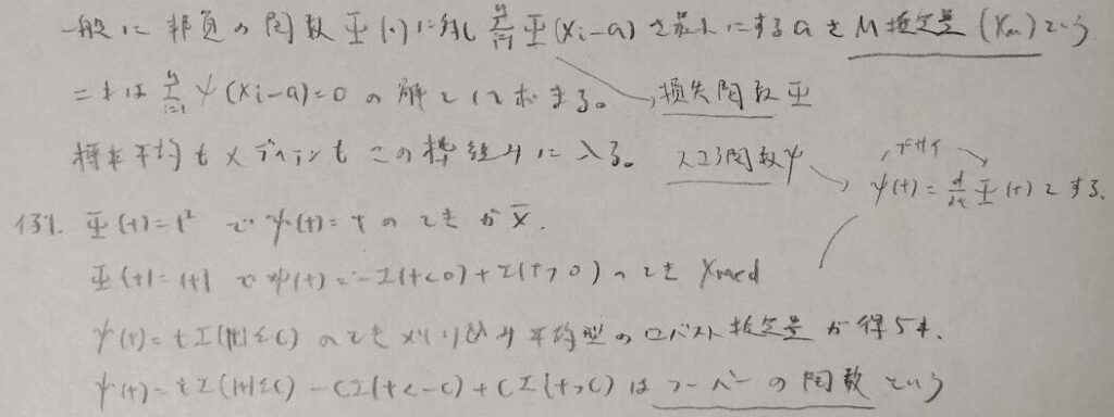 M推定量は損失関数Ψ(プサイ)を最小にする量でスコア関数ψ(プサイ)を用いた式が0になる解として求まります。これらの関数をどのように設定するかで標本平均やメディアンなどが次々と導出されるわけです。