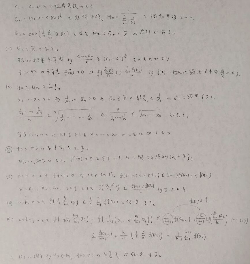 次の調和平均≦幾何平均≦算術平均は非常に重要です。統計検定1級でもここに関連する出題があります。