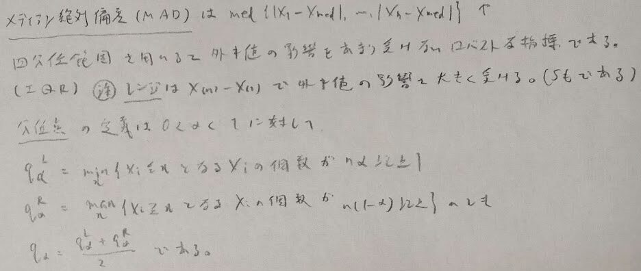 ここでは高校時代(早ければ中学数学)で学習する箱髭図などで登場する考えをより深めます。分散に相当するばらつきにあたる標本分散は外れ値の影響を大きく受けます。それでは外れ値の影響をあまり受けないロバストなばらつきの指標とは一体なんでしょうか。